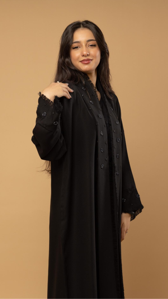 عباية أنيقة من دوائر الخرز الرمادي من الأمام والأكمام تعكس الاناقة والجاذبية ،خيار مثالي لمن تبحث عن إطلالة راقية ومتميزة في المناسبات الخاصة مما يعكس الذوق الرفيع