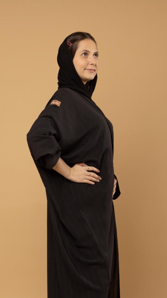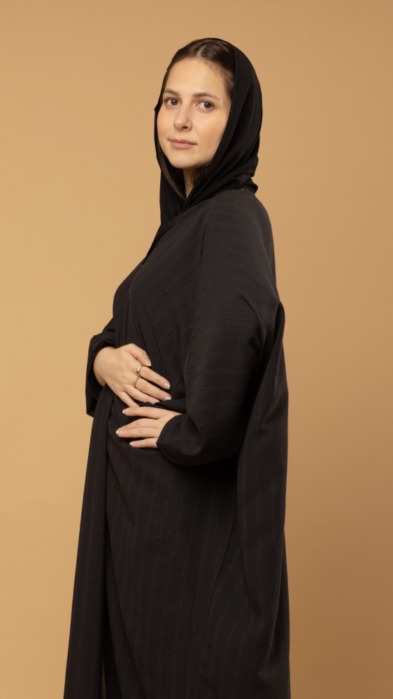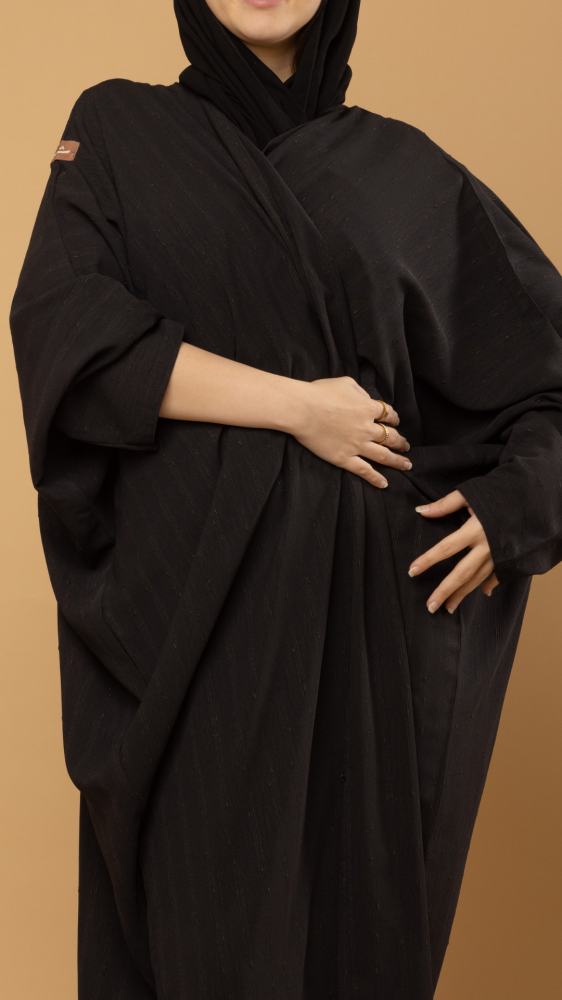 عباية عملية بتصميم قصة البشت من قماش الجاكار المشجر أكمام ضيقة تعكس الفخامة والراحة. إطلالة عملية مناسبة لجميع الأنشطة
