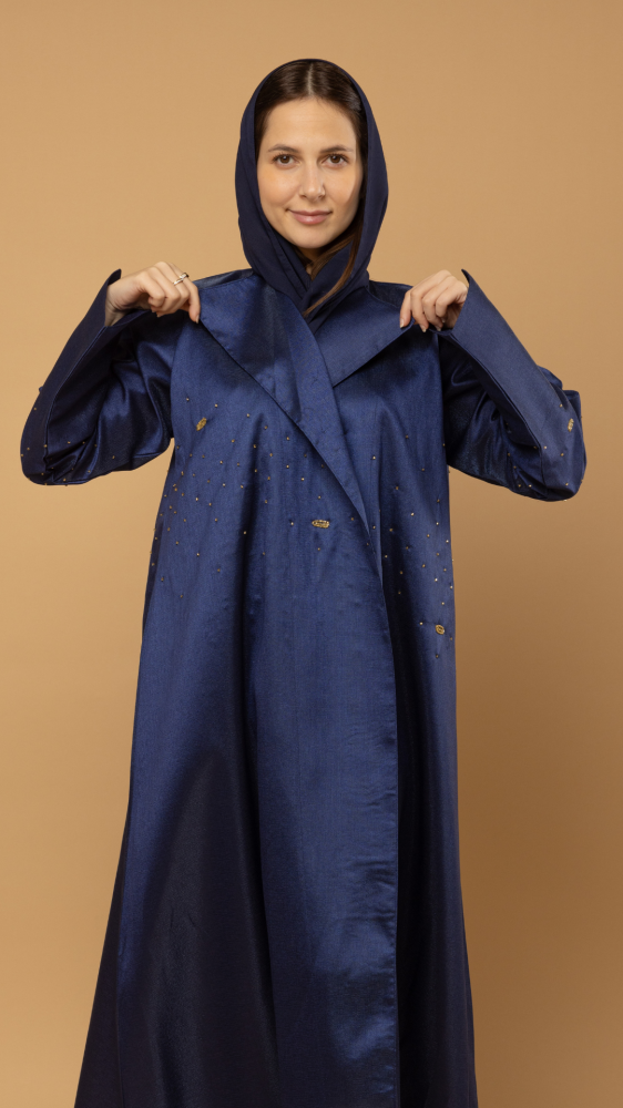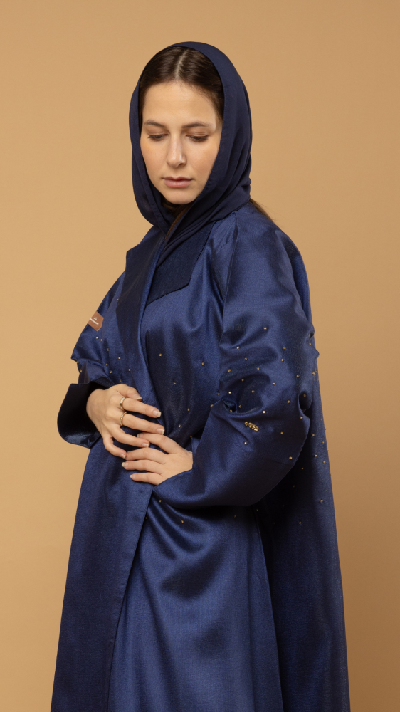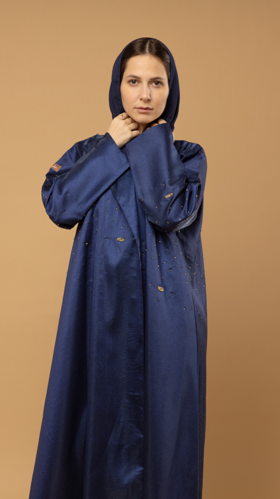 عباية جذابة بتصميم من قماش الاورقنزا الكحلي مع نثرة من الخرز الذهبي والياقة من الأمام. خيار مثالي لمن تبحث عن إطلالة مبهجة وأنيقة مما يجعلها مناسبة لمختلف الأنشطة