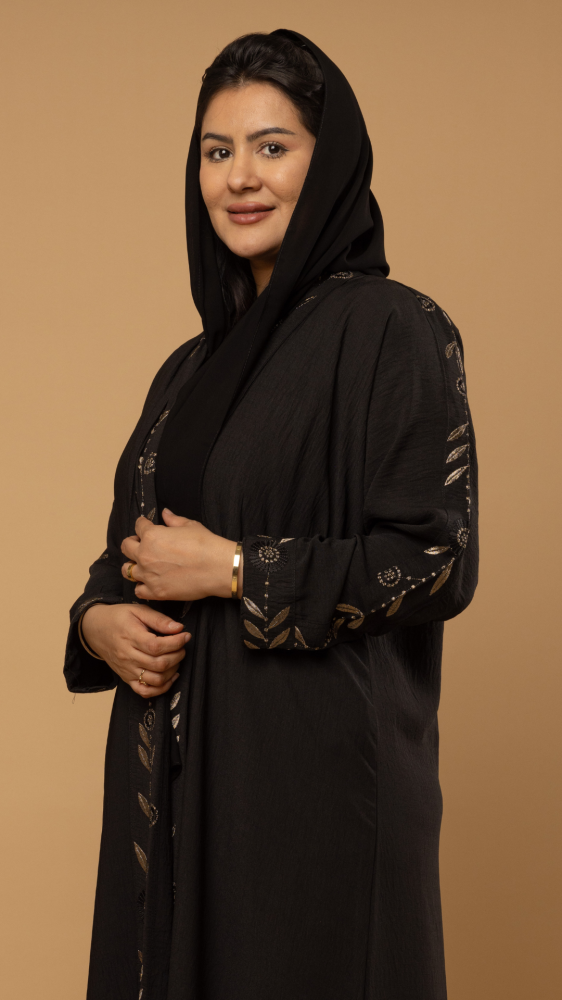 عباية أنيقة بتصميم مميز بتطريز أغصان الشجر من الأمام وطول الأكمام وفتحة الكم يعكس الاناقة . خيار مثالي لمختلف الأنشطة
