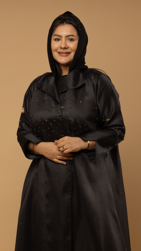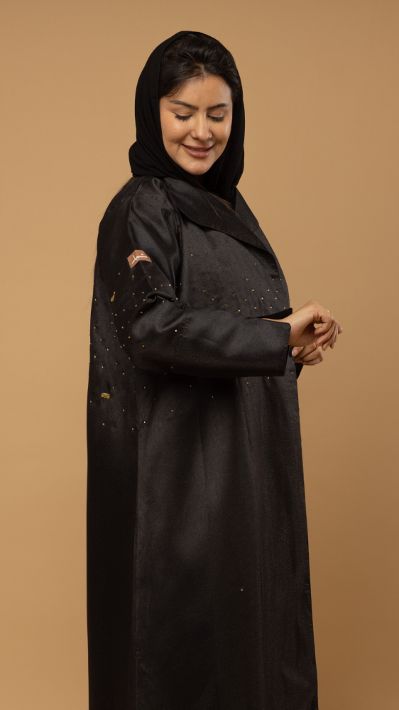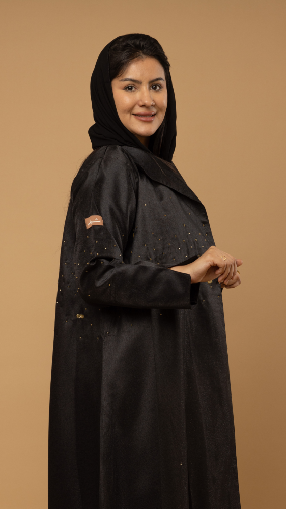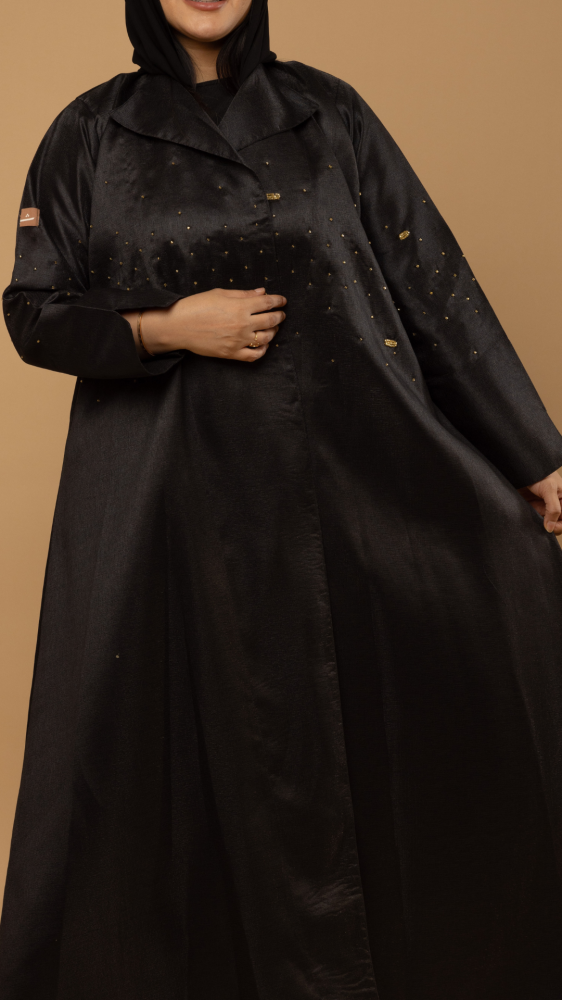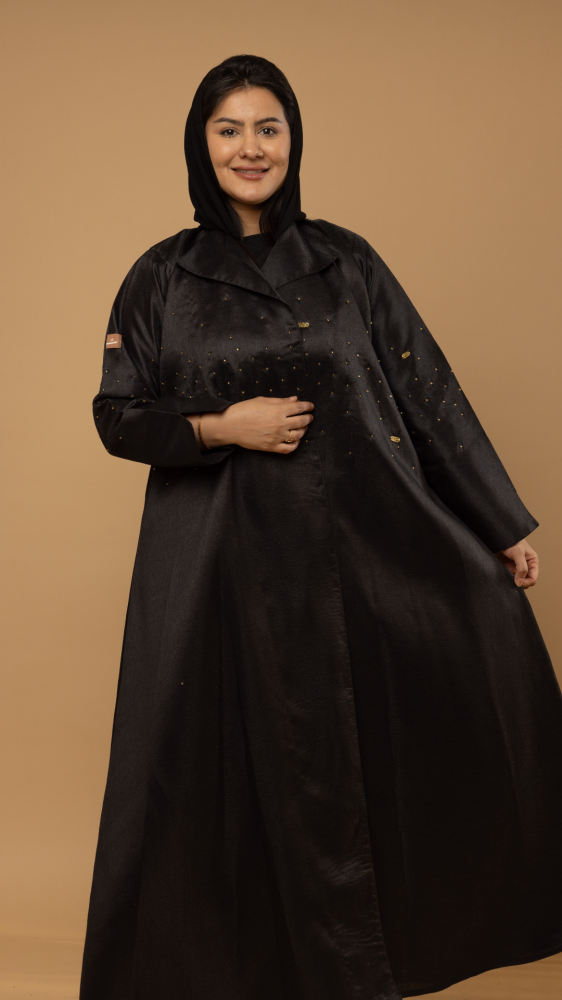 عباية جذابة بتصميم من قماش الاوقنزا الاسود مع نثرة الخرز الذهبي والياقة من الأمام ،خيار مثالي لمن تبحث عن إطلالة راقية وأنيقة مما يجعلها مناسبة لمختلف الأنشطة