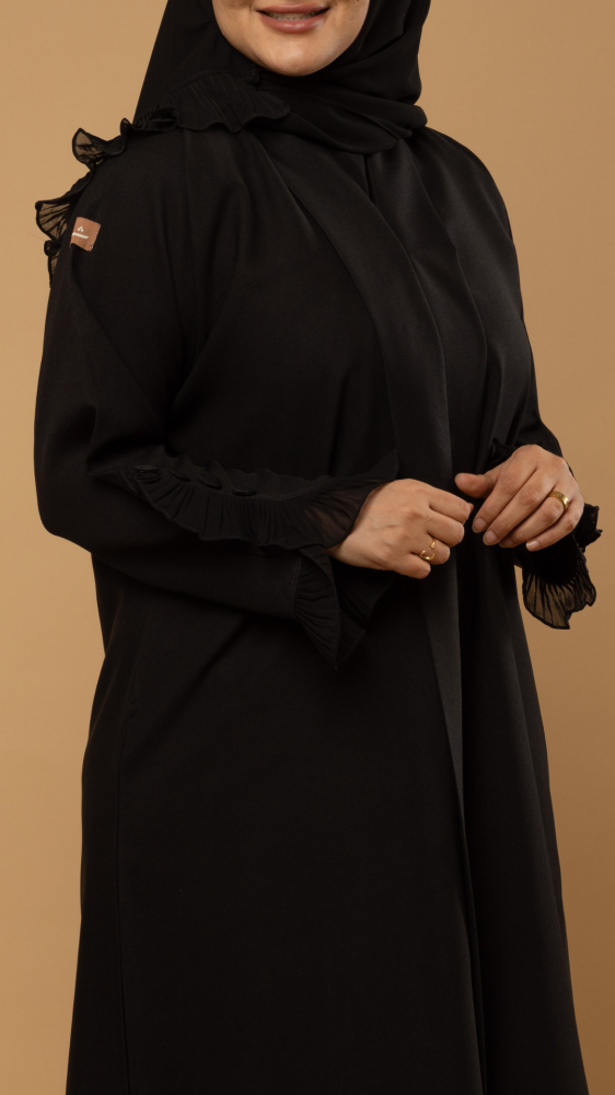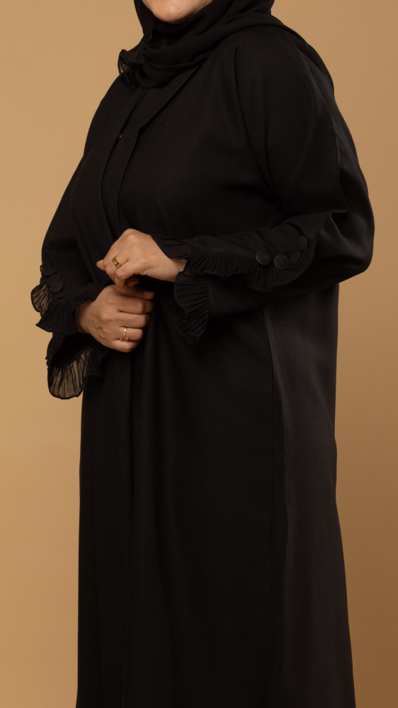 عباية عملية بتصميم بليسيه على الأكمام مع اضافة ازارير ولفة من الأمام يعكس الجاذبية . خيار مثالي للإطلالات اليومية وللعمل