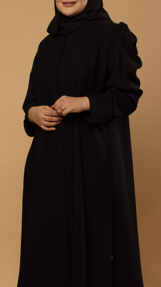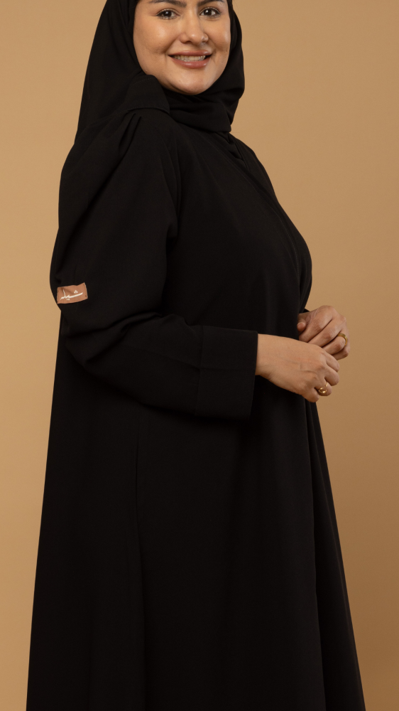 عباية سادة عملية بتصميم مميز بكسر في الاكتاف وقلبة في الكم. خيار مثالي للاستخدام اليومي وبيئة العمل
