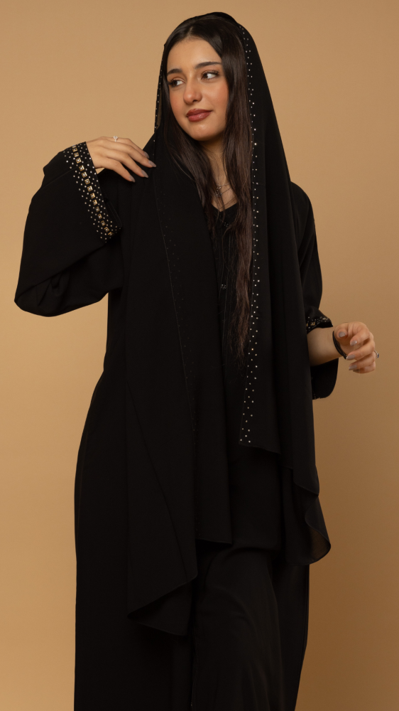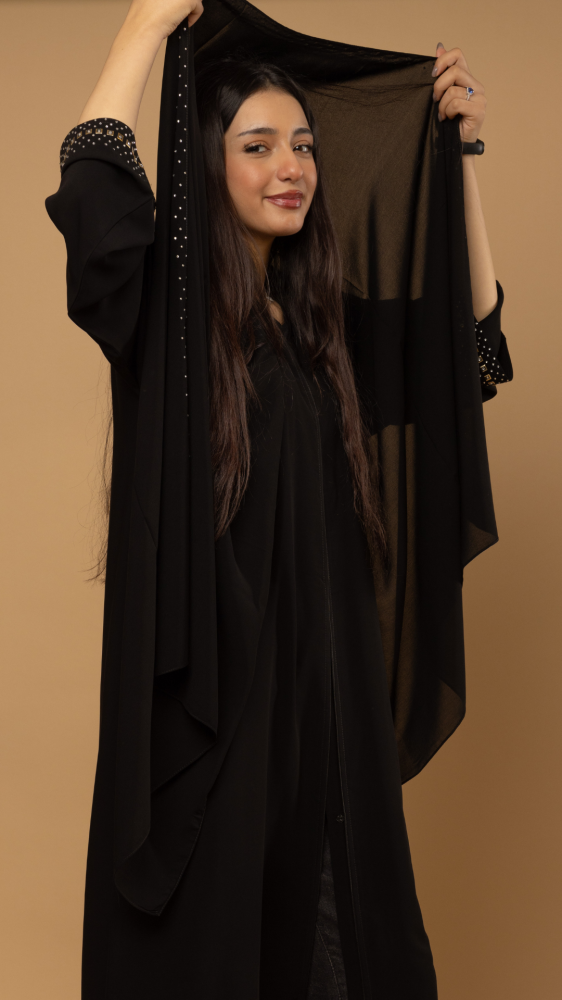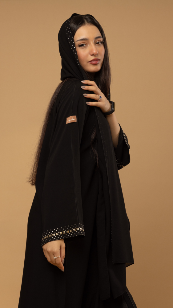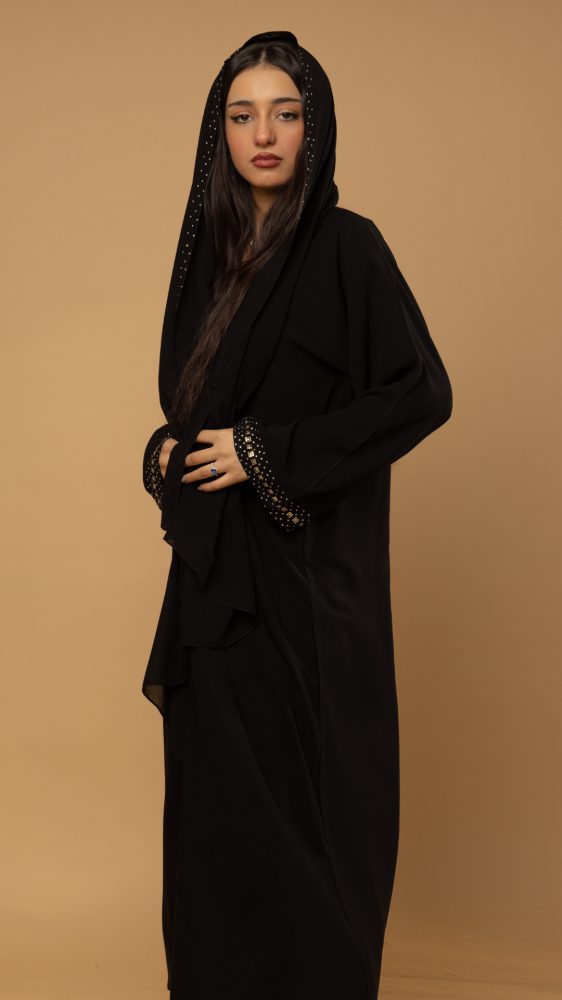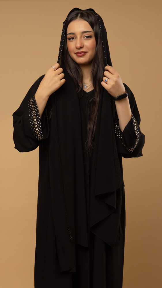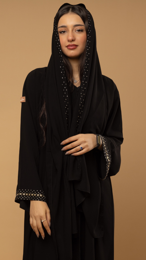 عباية أنيقة بتصميم مجموعة من الكريستالات باللون الأبيض و المعادن الذهبية تضفي لمسة أنيقة تجمع مابين الرقي والراحة ،خيار مثالي لمختلف الأنشطة
