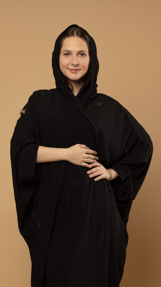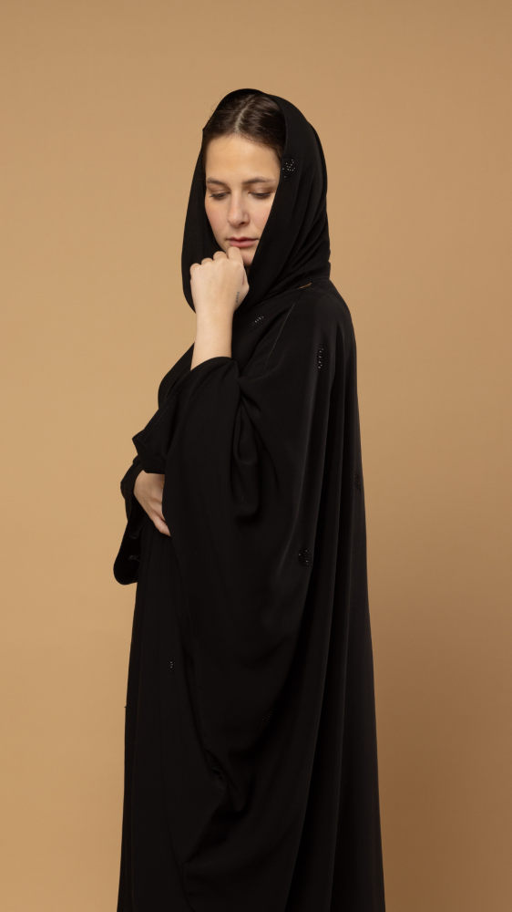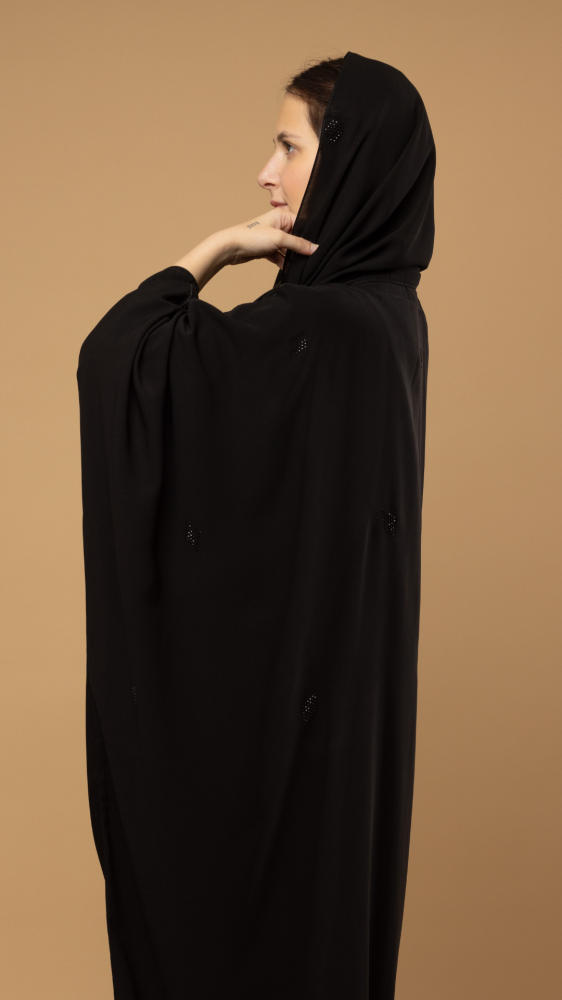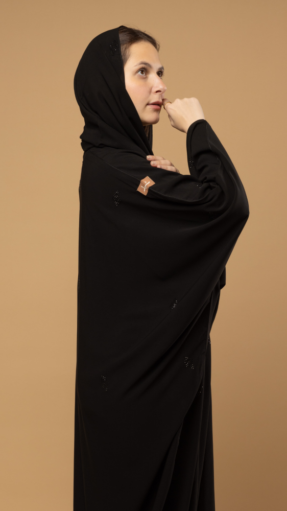 عباية راقية بنثرة معينات من الكريستال باللون الأسود تضفي طابع جميل ،خيار مثالي للإطلالات اليومية