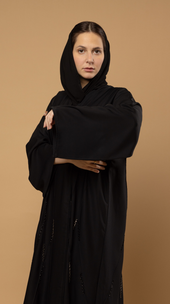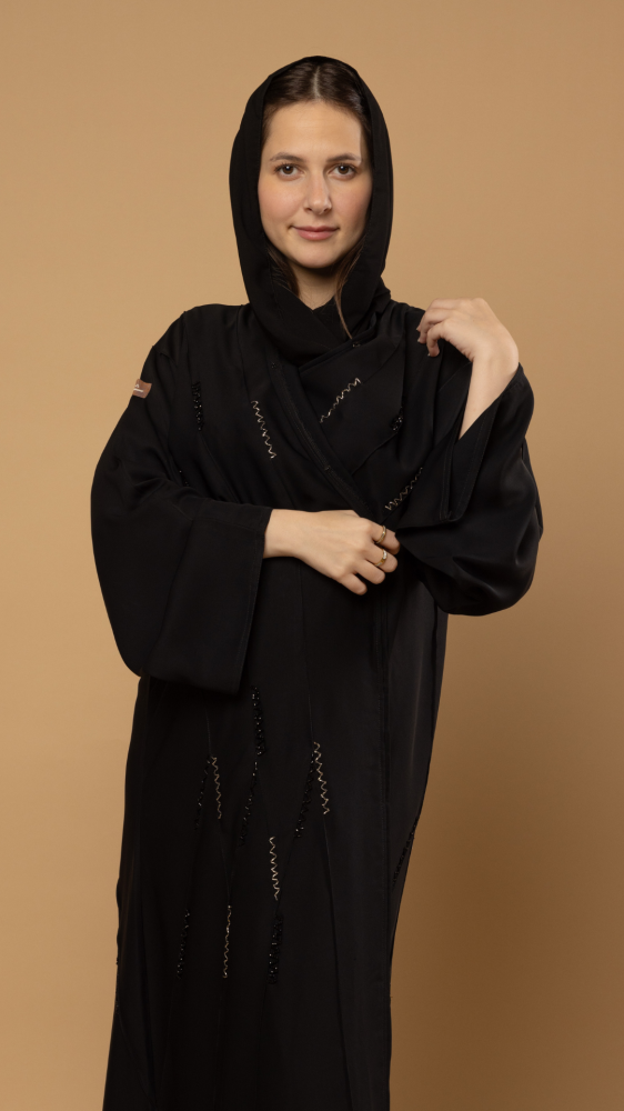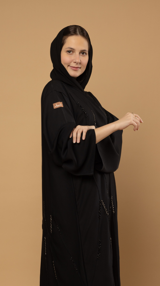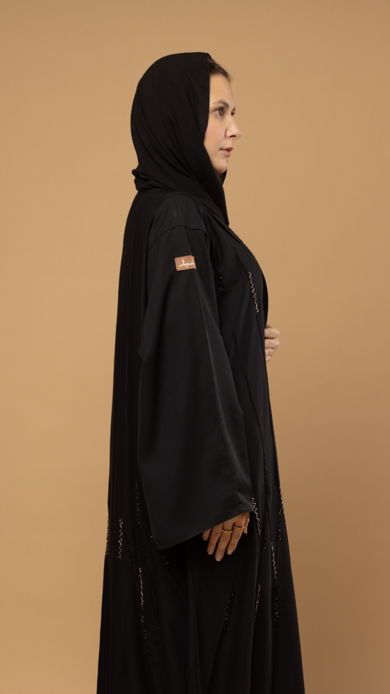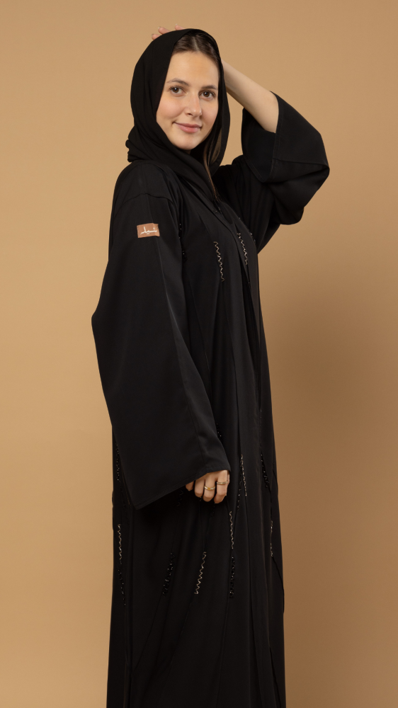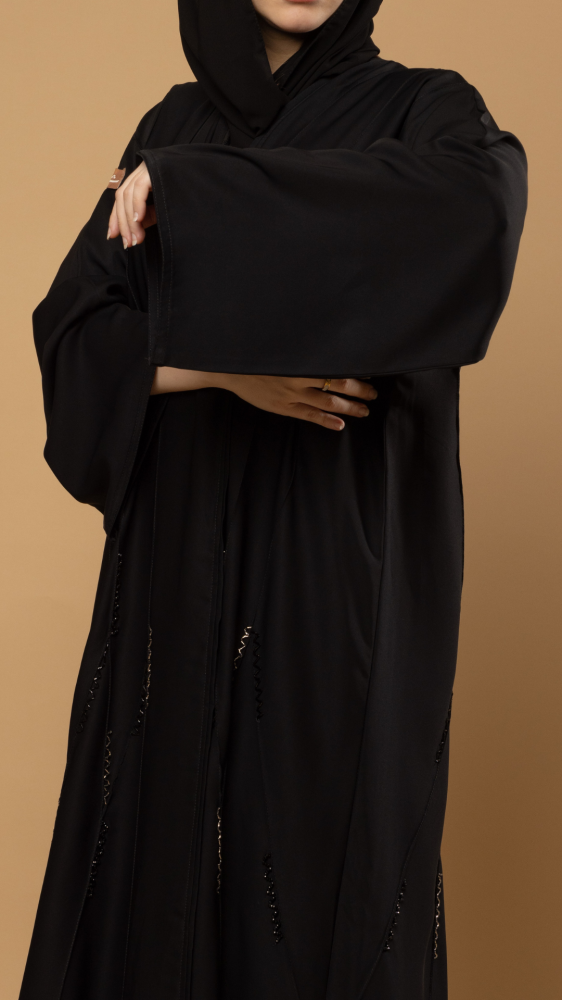 عباية مزخرفة بشك بالخرز الفضي والأسود تضيف لمسة جمالية فريدة . خيار مثالي يجمع مابين الاناقة والراحة تناسب للاستخدام اليومي