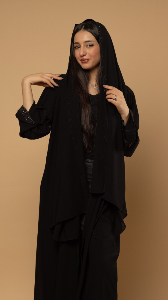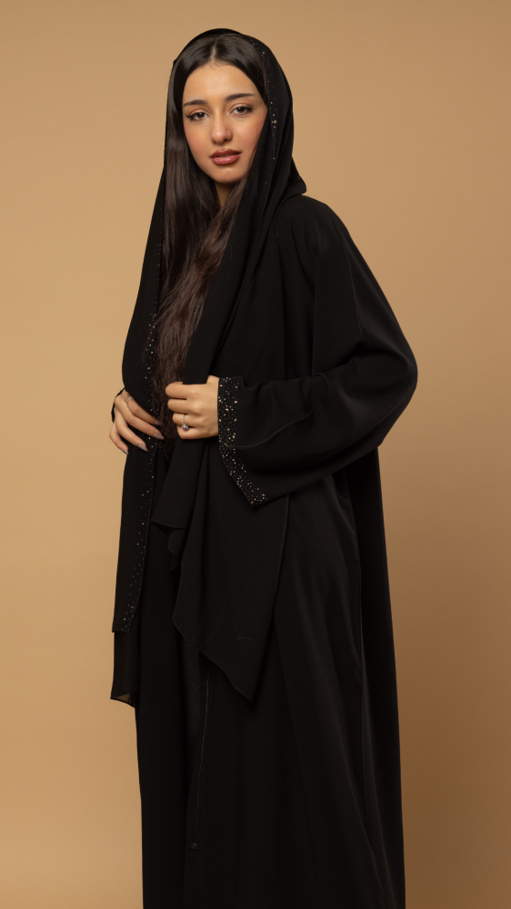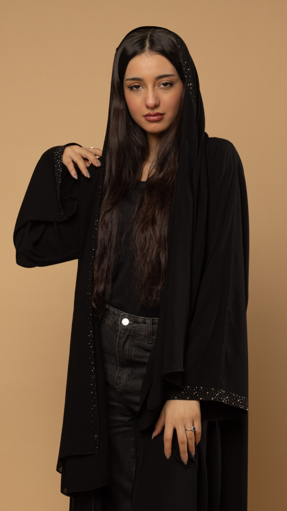 عباية ناعمة بتصميم مميز بنثرة كريستال على الأكمام باللون الرمادي والمعادن تعكس الفخامة والراحة. مثالية للحياة اليومية، توفر الراحة والأناقة.
