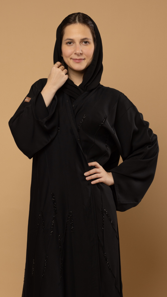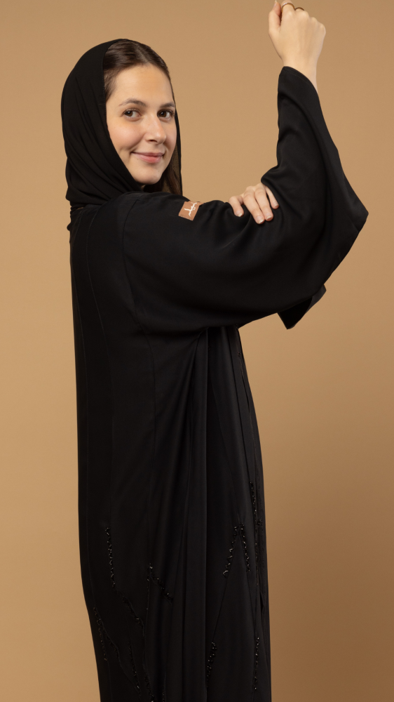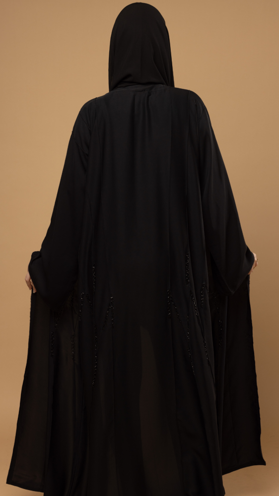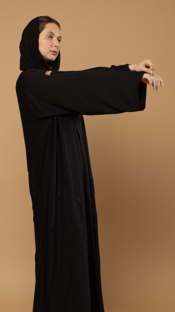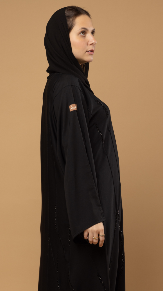 عباية مزخرفة بشك بالخرز الأسود تضيف لمسة جمالية فريدة خيار مثالي يجمع مابين الاناقة والراحة يناسب للاستخدام اليومي