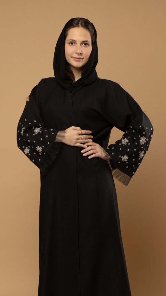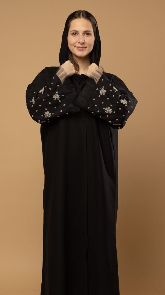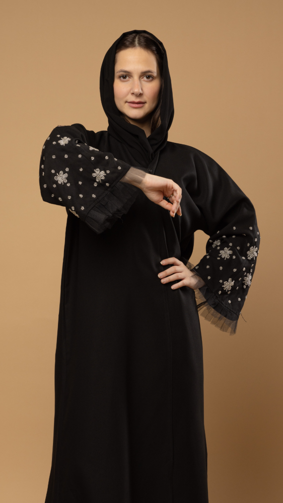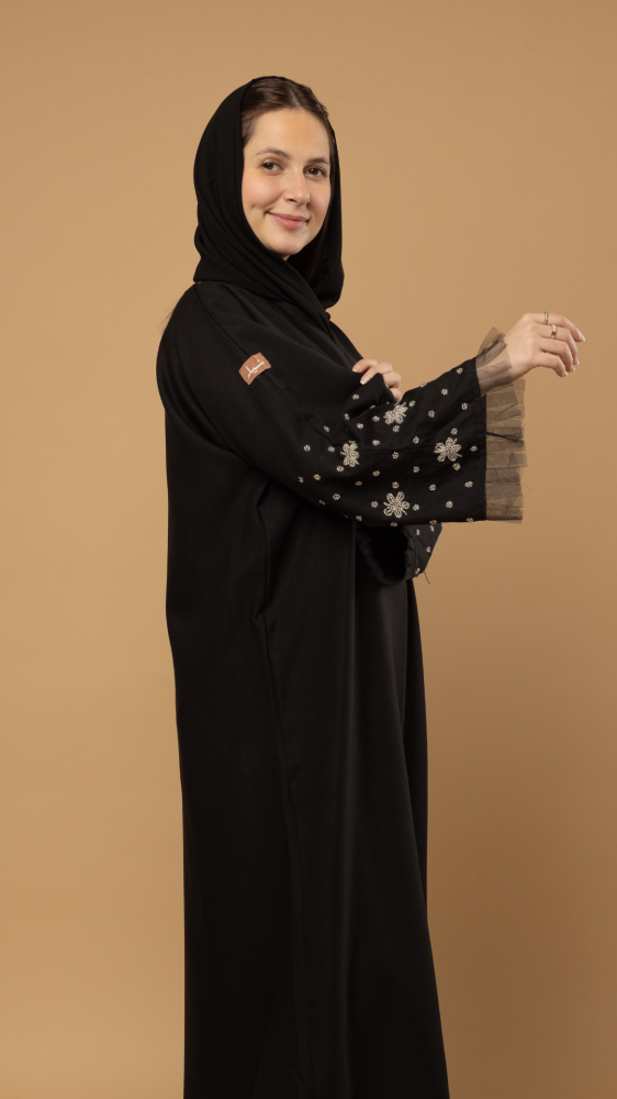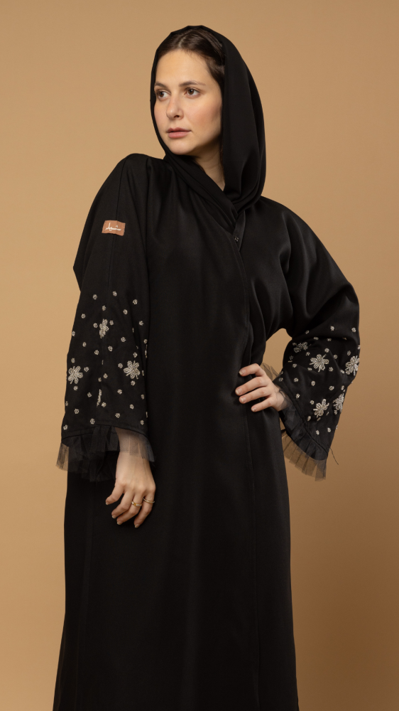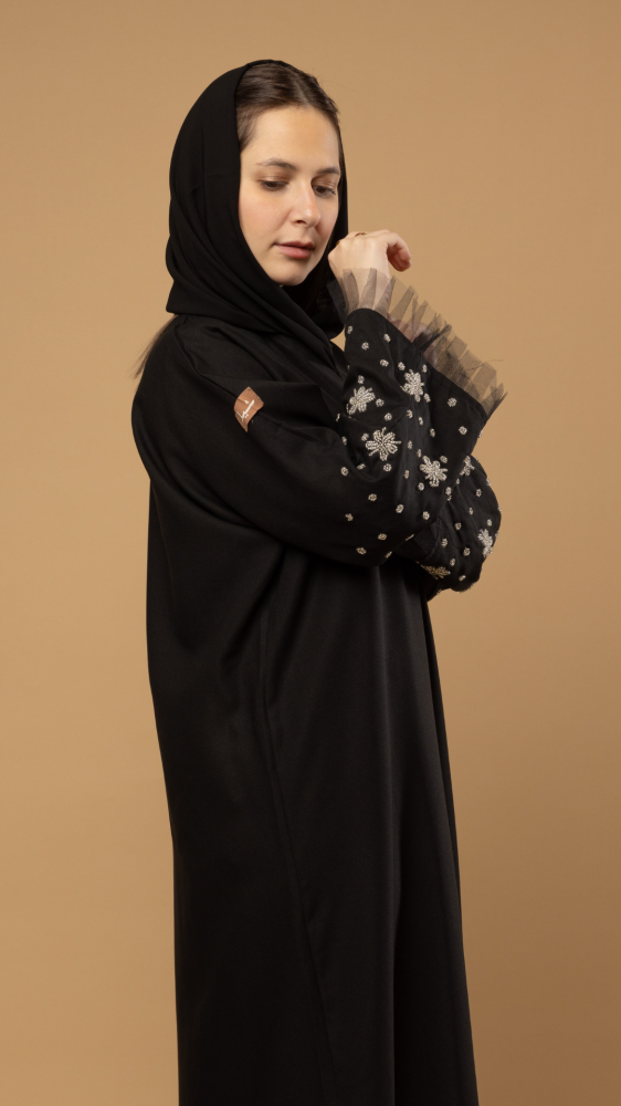 عباية أنيقة بتصميم مميز بكسر من قماش التل على الأكمام مع اضافة شك يدوي باللون الفضي يضفي طابع انيق خيار مثالي للمناسبات الخاصة