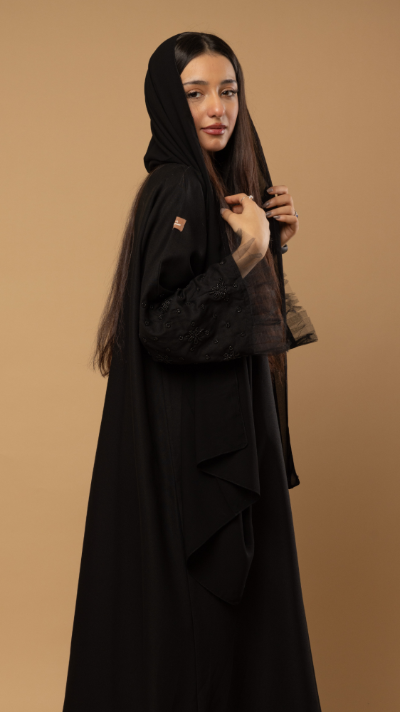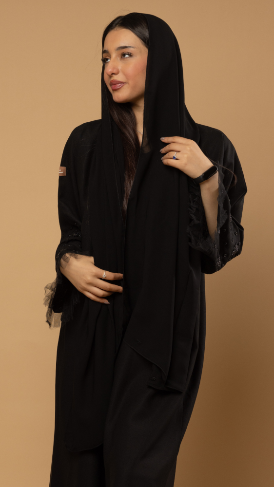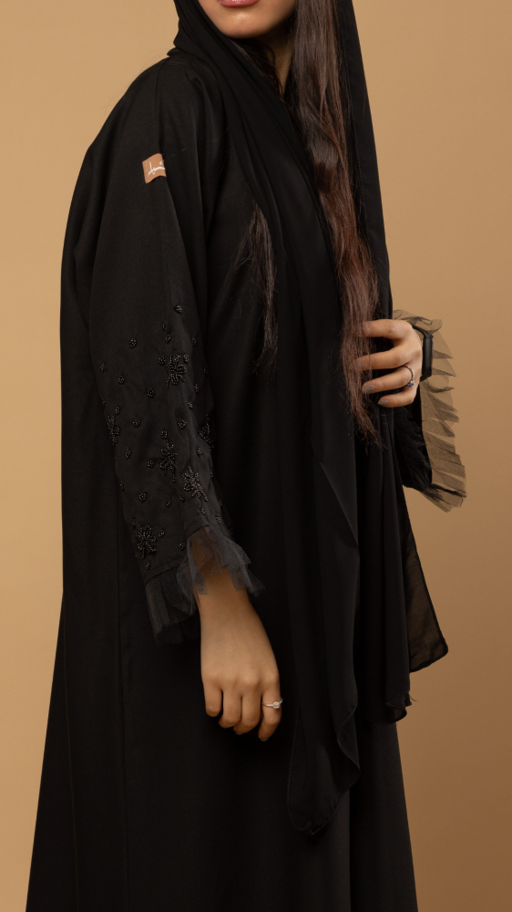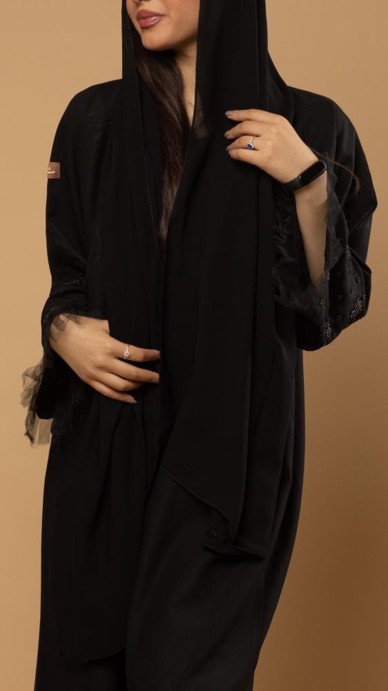عباية أنيقة بتصميم مميز بكسر من التل على الأكمام مع شك يدوي باللون الاسود يضفي طابع من الفخامة خيار مثالي للمناسبات والاحتفالات
