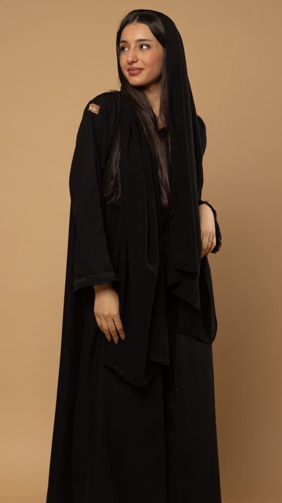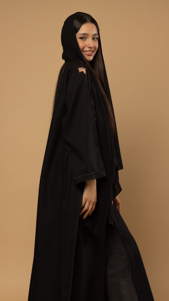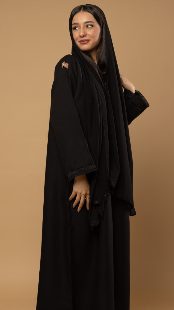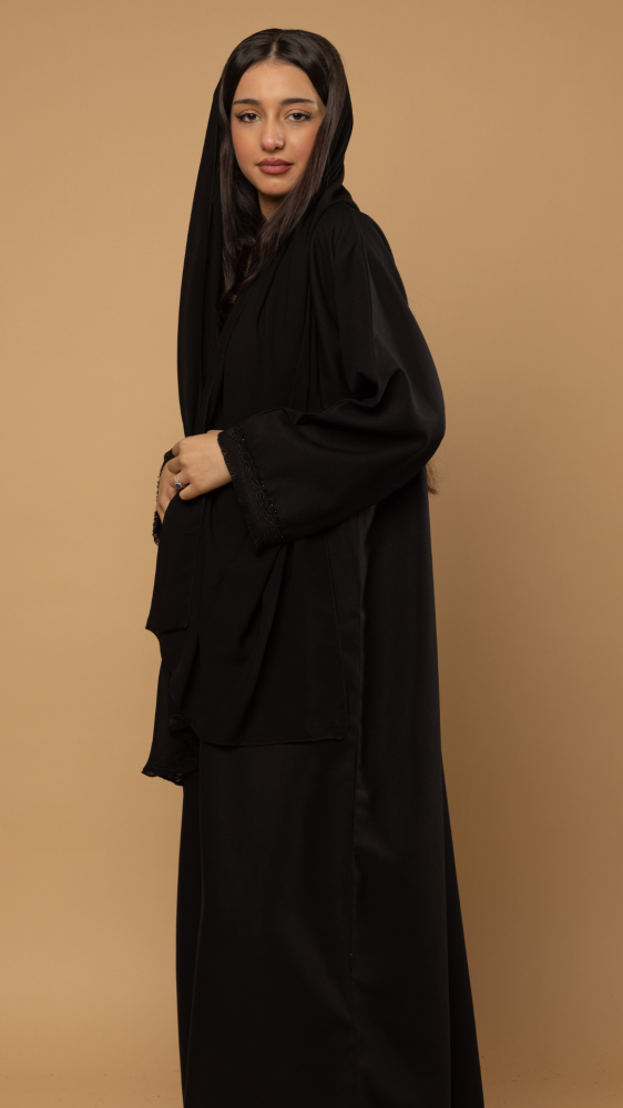 عباية مريحة بتصميم مميز على الأكمام بشك يدوي باللون الأسود على الأكمام مع تطريز مكينة بالخيط الأسود خيار مثالي للاستخدام اليومي والعمل