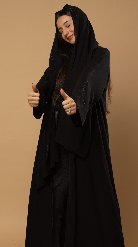 عباية عملية بتصميم من الكريستال الأسود على الأكمام تجمع النعومة والراحة . خيار مثالي للاستخدام اليومي والعمل