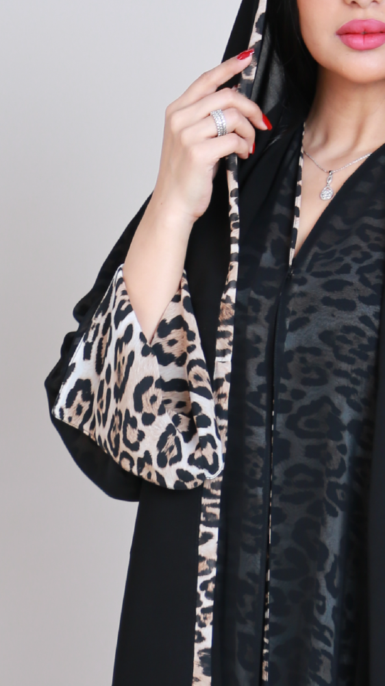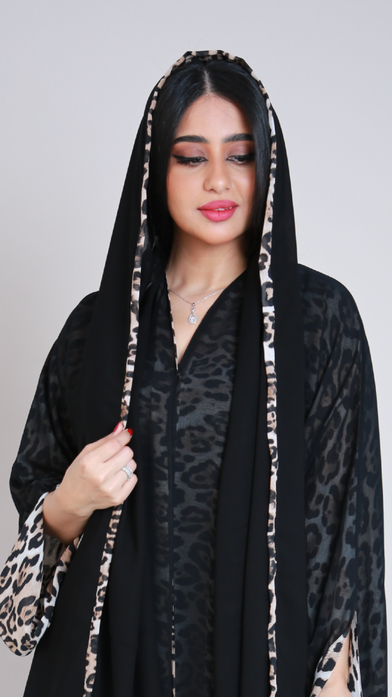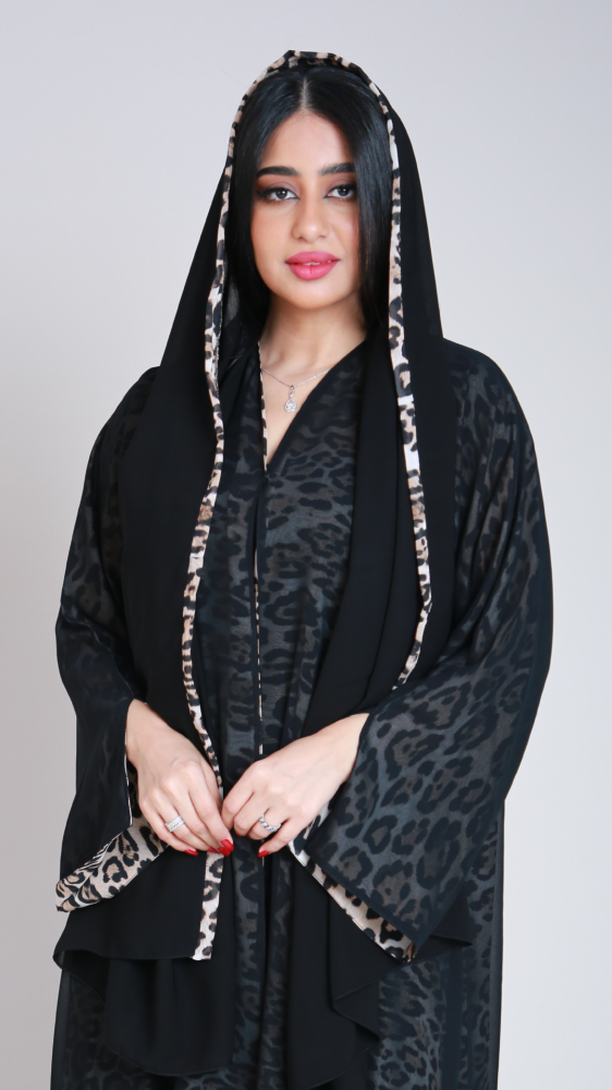 عباية دبل فيس من قماش الشيفون الحرير بنقش تايقر قطعة مثالية تعكس ذوقك الخاص تمنح احساس الراحة والتميز في ان واحد