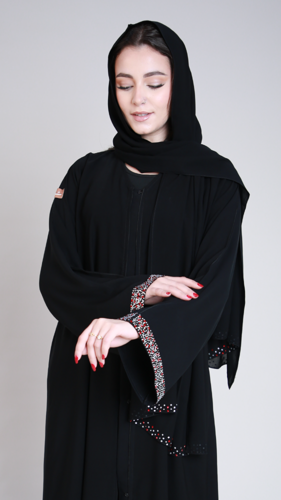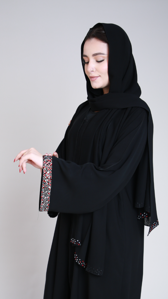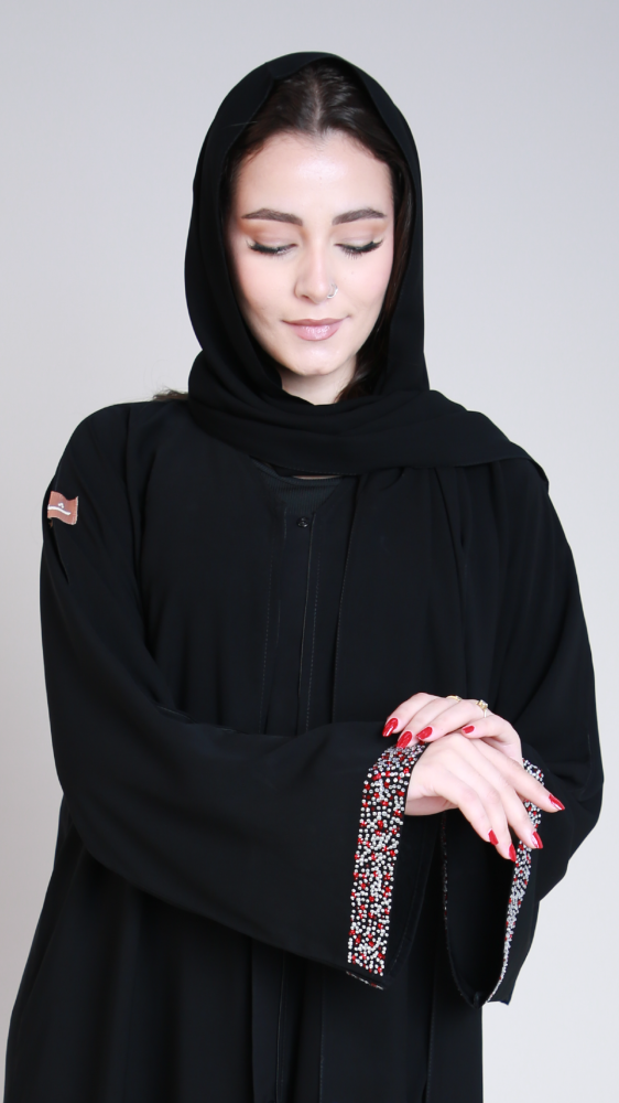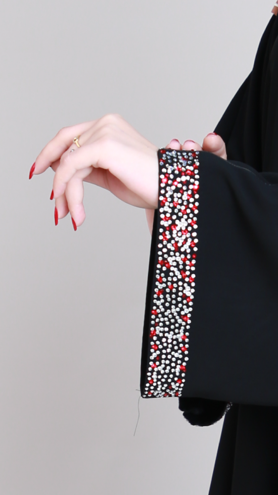 تألقي بإطلالة أنيقة مع هذه العباية بتصميم من الكريستال الفضية والأحمر على أطراف الكم تضفي لمسة من الفخامة والأناقة .