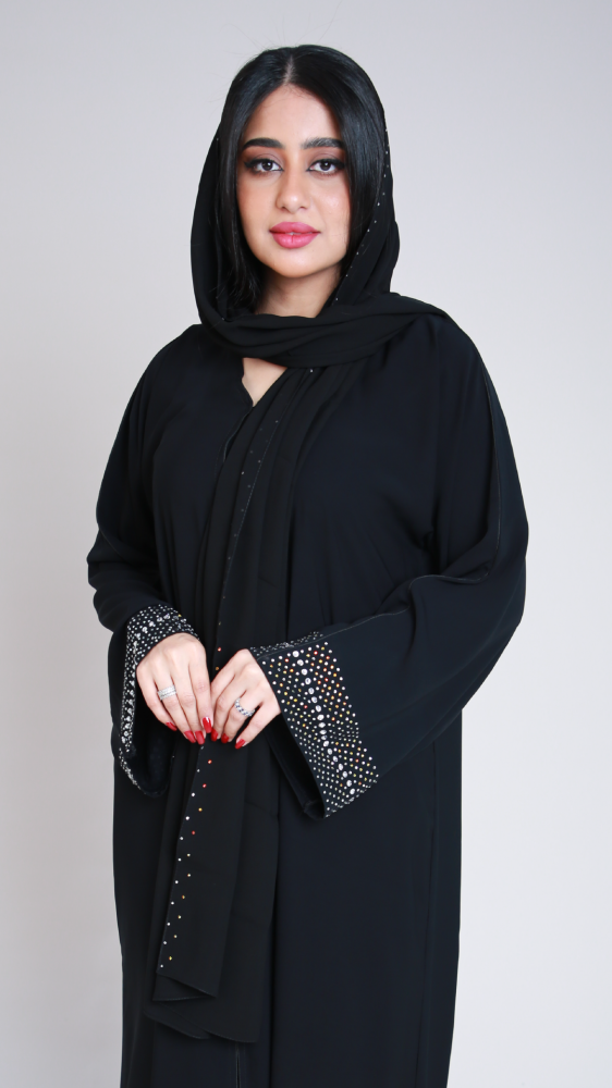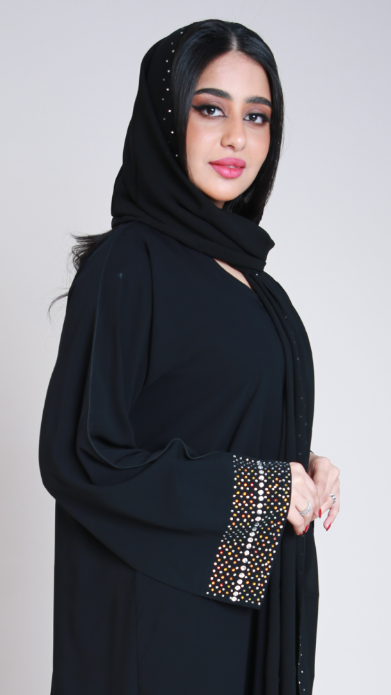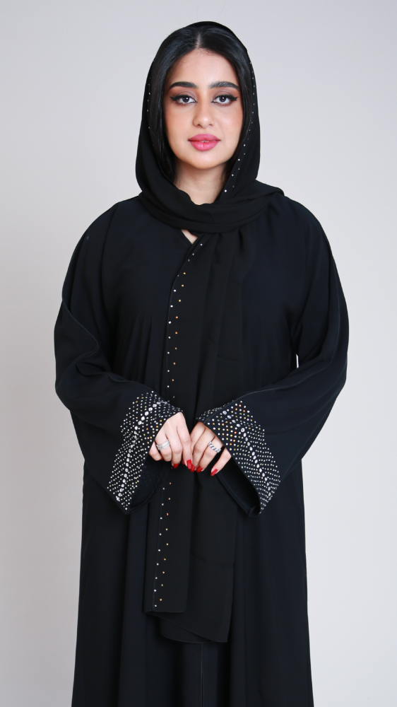 تألقي بإطلالة أنيقة مع هذه العباية بكريستالات ومعدن ذهبي عالاكمام يضفي طابع انيق وجذاب