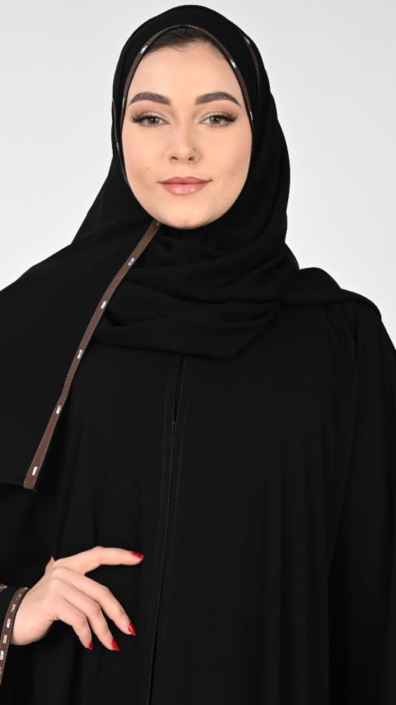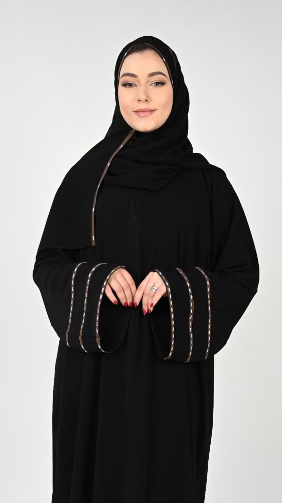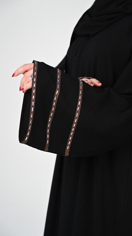 عباية بتصميم مبتكر بشرايط باللون البني على الأكمام تضفي طابع من النعومة والرقي مما يجعلها الخيار الأمثل لجميع المناسبات