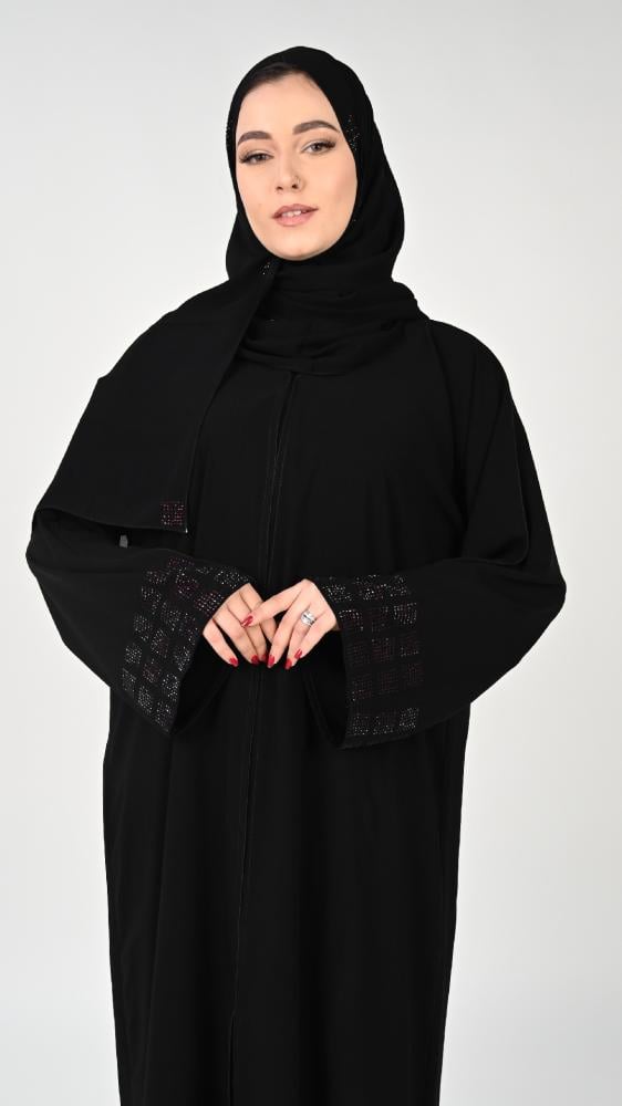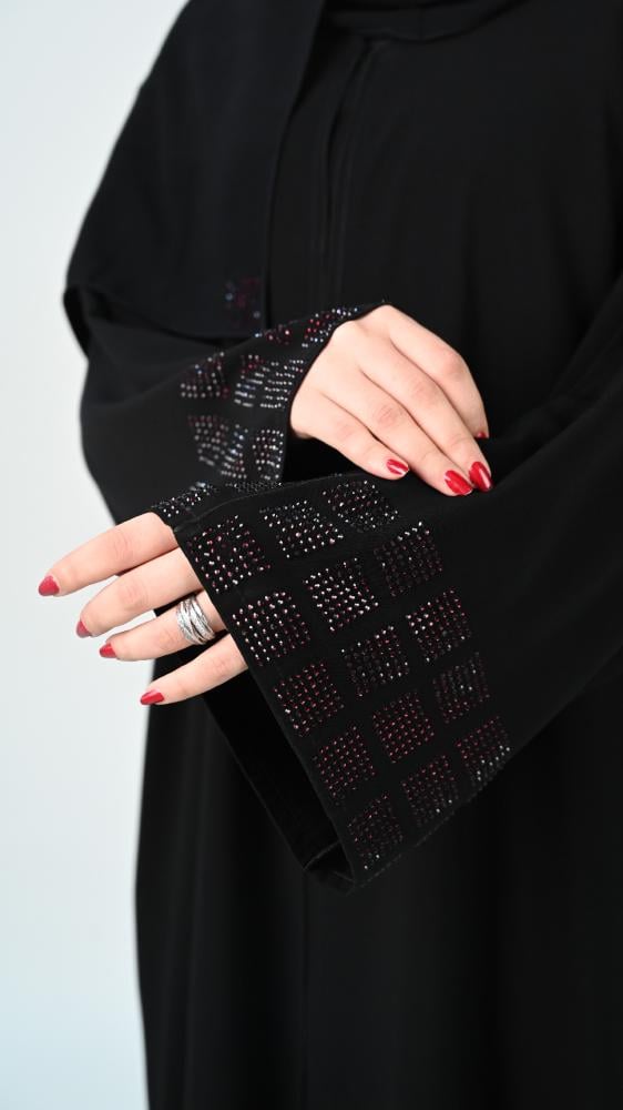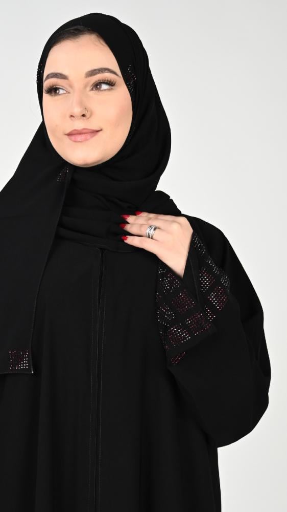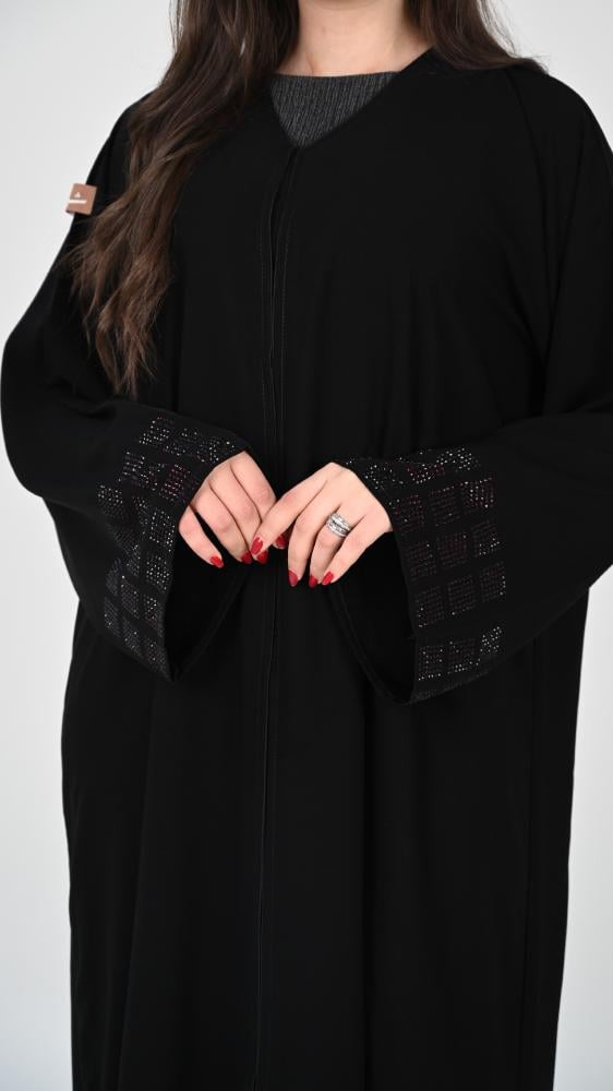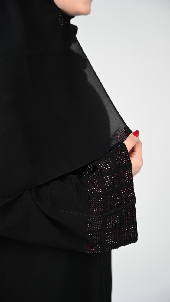 عباية بتصميم مبتكر بكريستالات على شكل مربعات باللون العودي على الأكمام تضفي طابع من الفخامة والرقي مما يجعلها الخيار الأمثل لجميع المناسبات