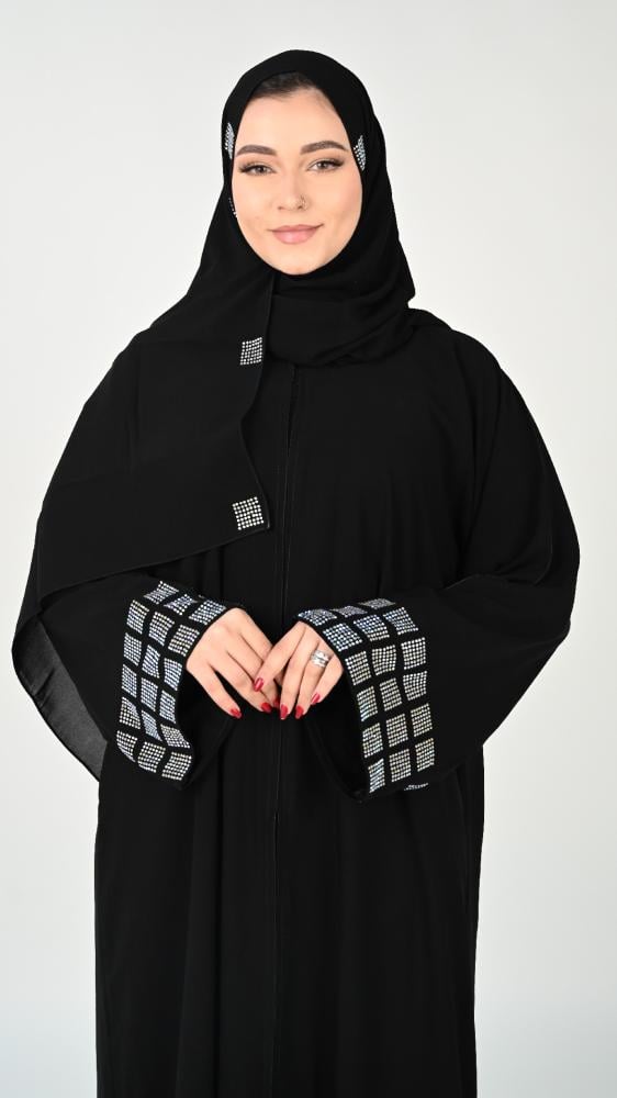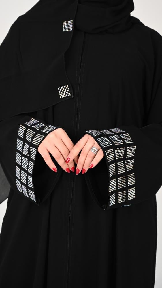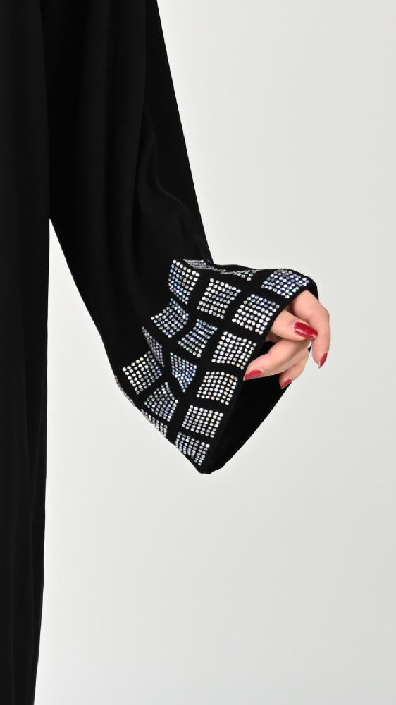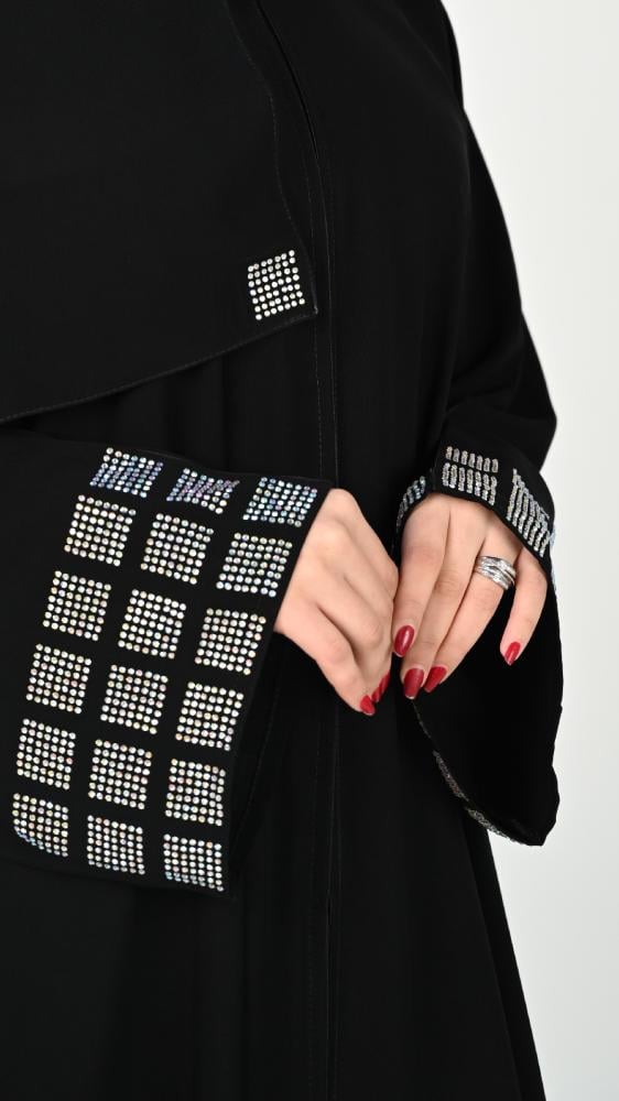 عباية بتصميم مبتكر بكريستالات على شكل مربعات باللون الفضي على الأكمام تضفي طابع من الفخامة والرقي مما يجعلها الخيار الأمثل لجميع المناسبات