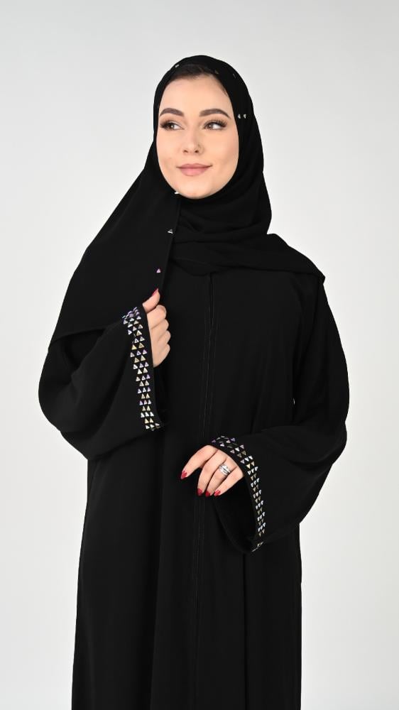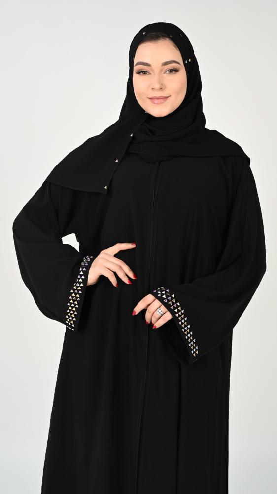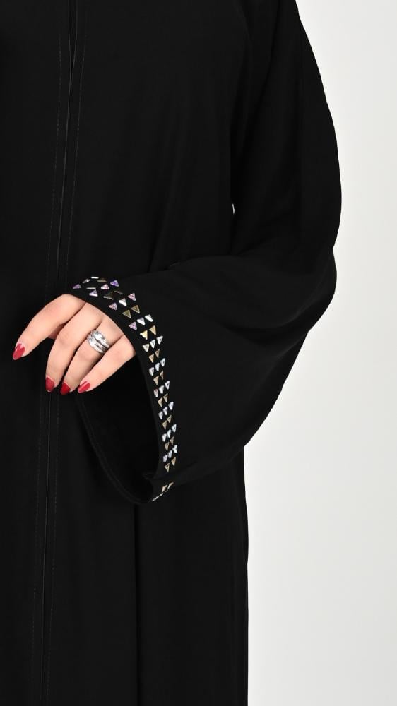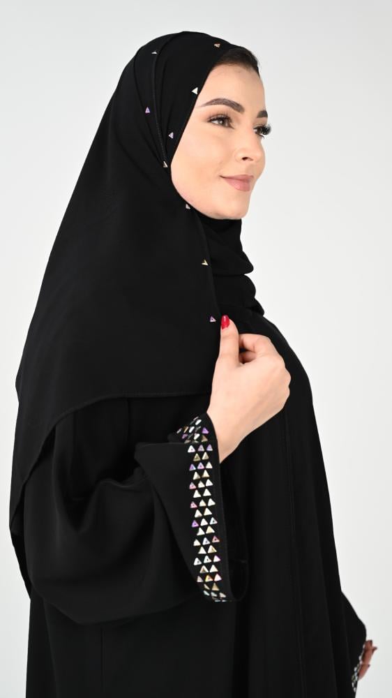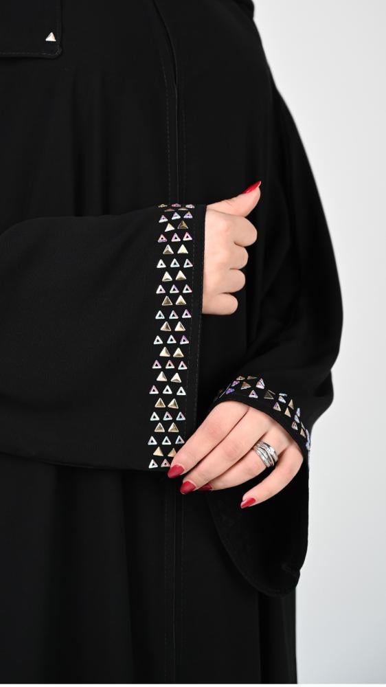 عباية بتصميم مبتكر من المعدن المثلث على الأكمام تضفي طابع من الفخامة والرقي مما يجعلها الخيار الأمثل لجميع المناسبات