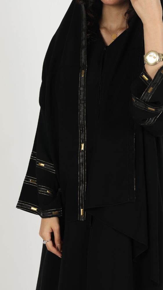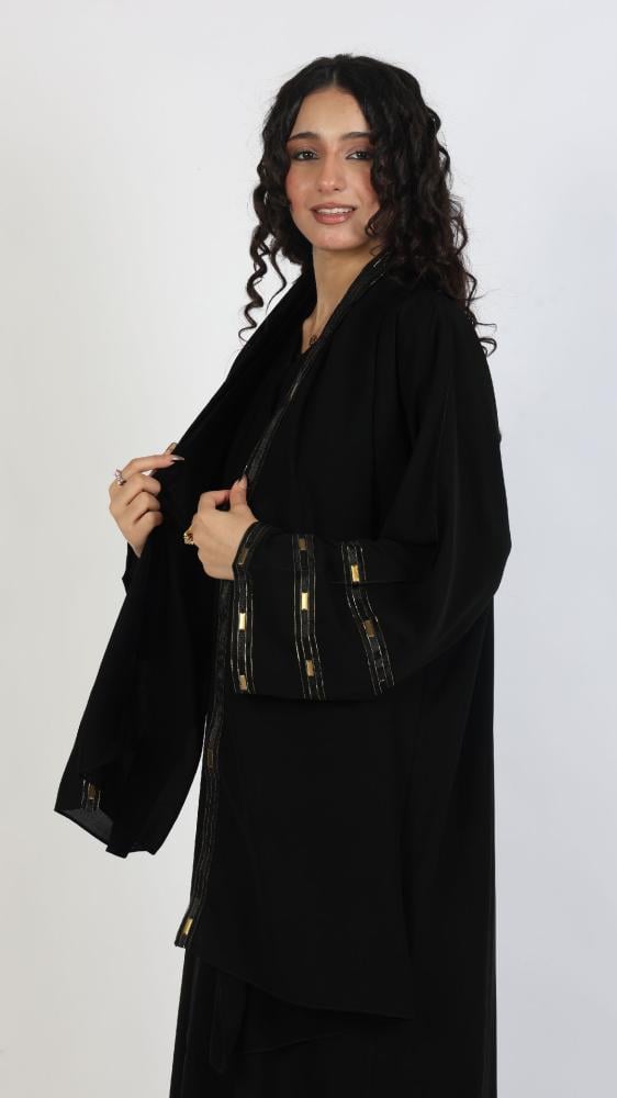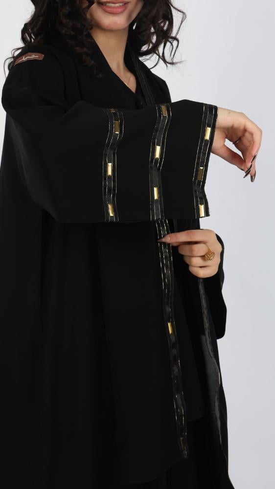 عباية بتصميم راقي على الأكمام من القصب الذهبي والمعدن الذهبي خيار مثالي للمناسبات