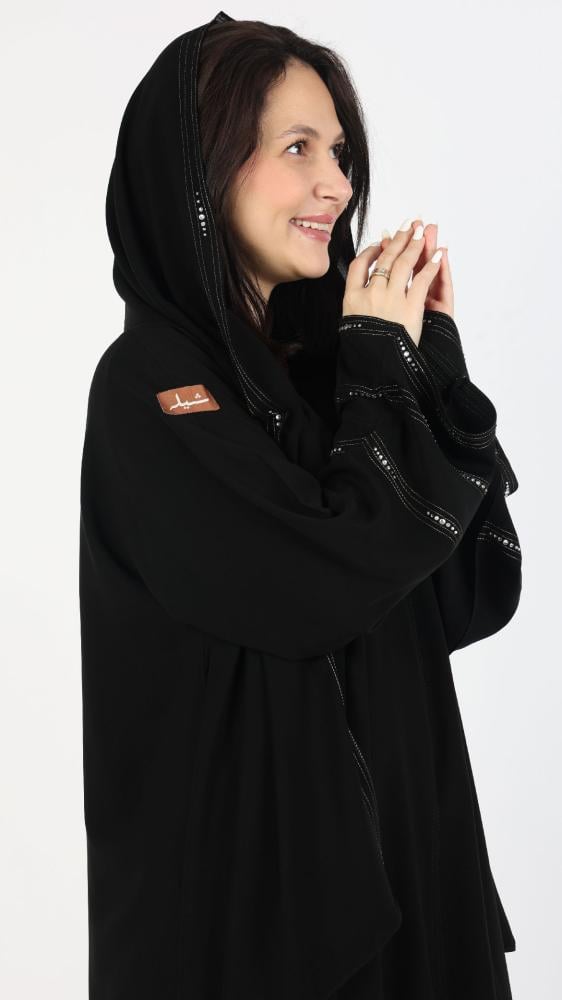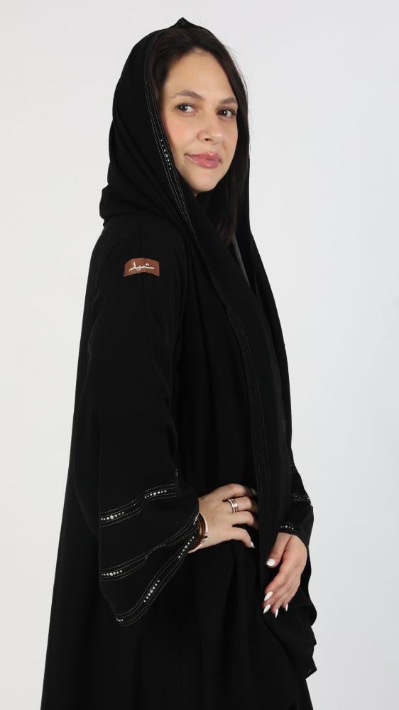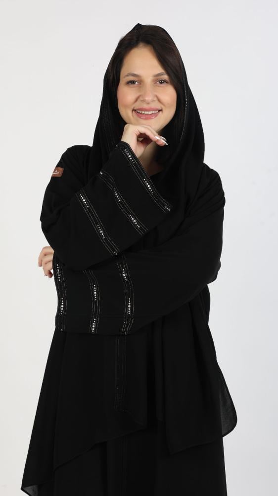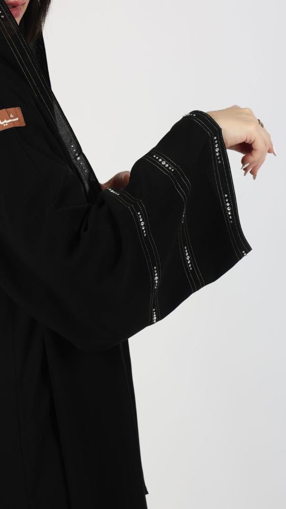 عباية بتصميم من القصب الذهبي على الأكمام مع كريستال يضفي طابع من الاناقة والرقي