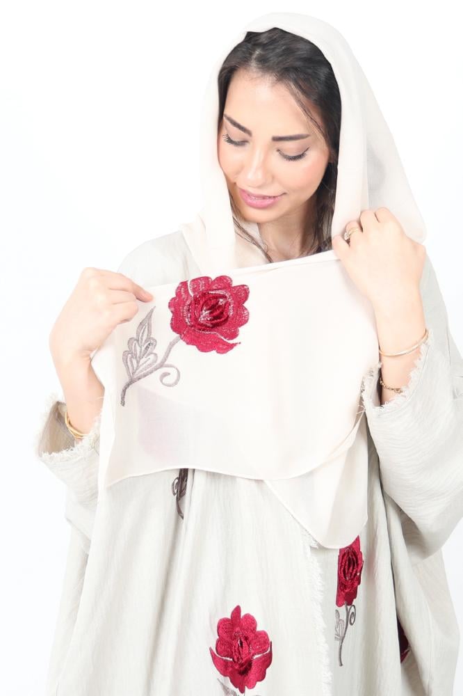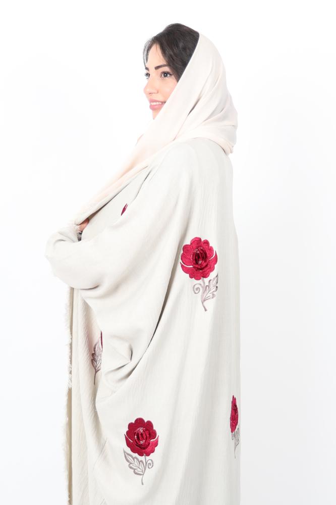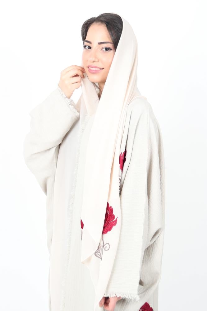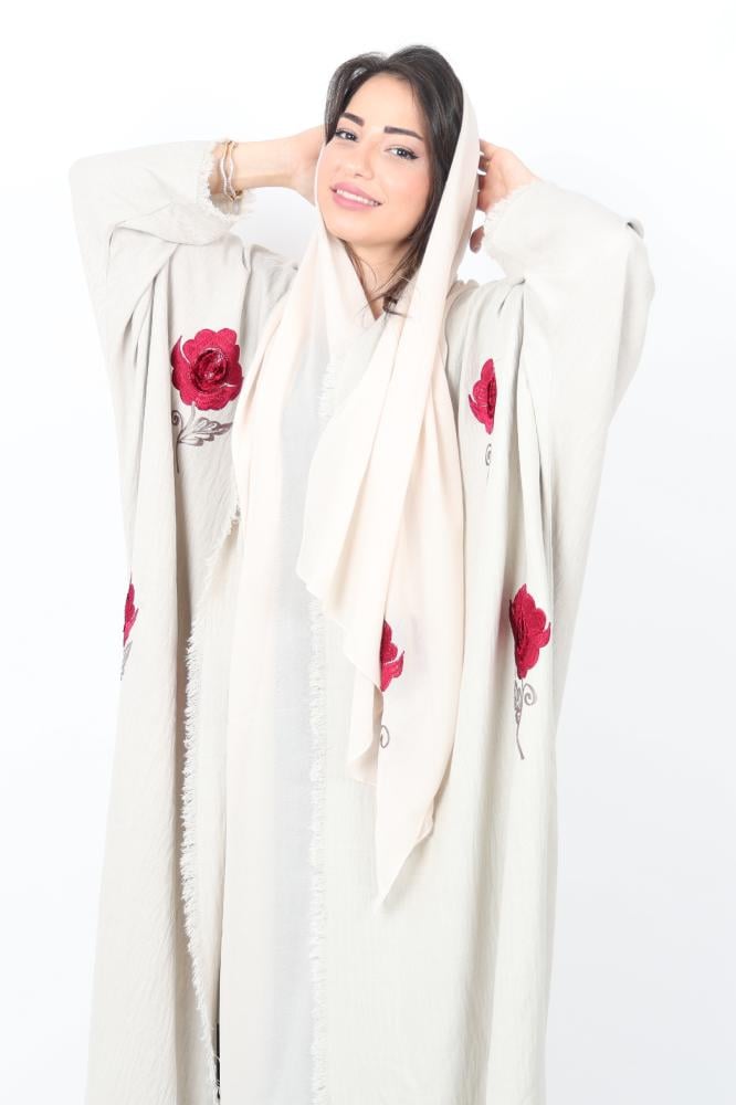 عباية مناسبة للسفر والدوام باللون البيج مع وردات على العباية باللون الأحمر