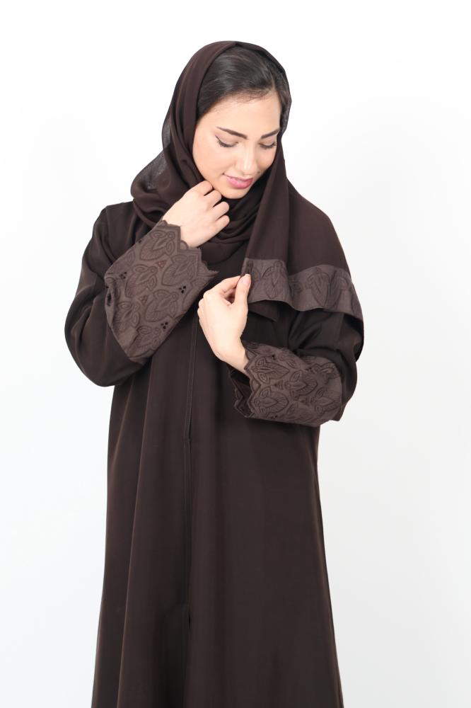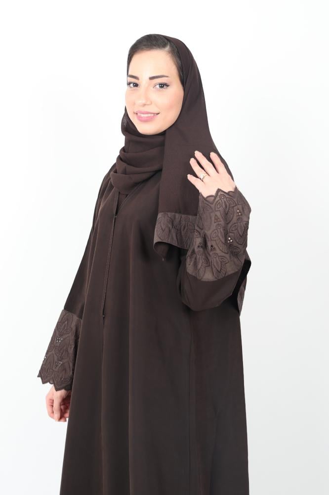 عباية باللون البني المحروق مع اضافة قماش الركامة على الأكمام
