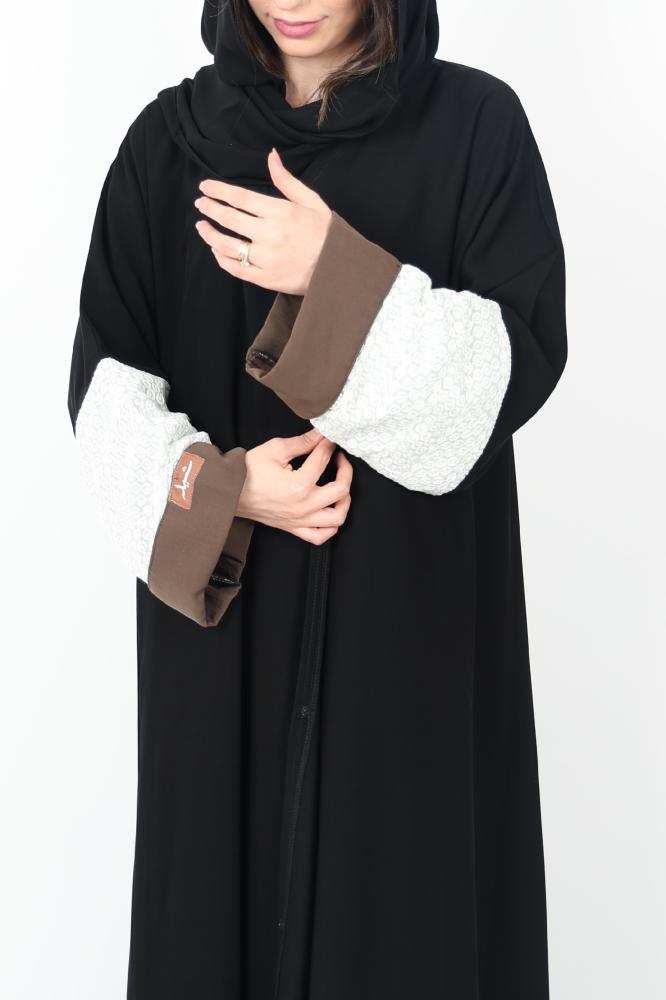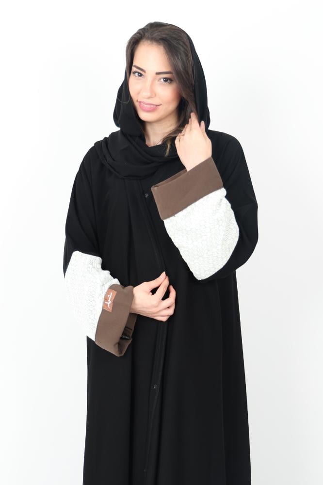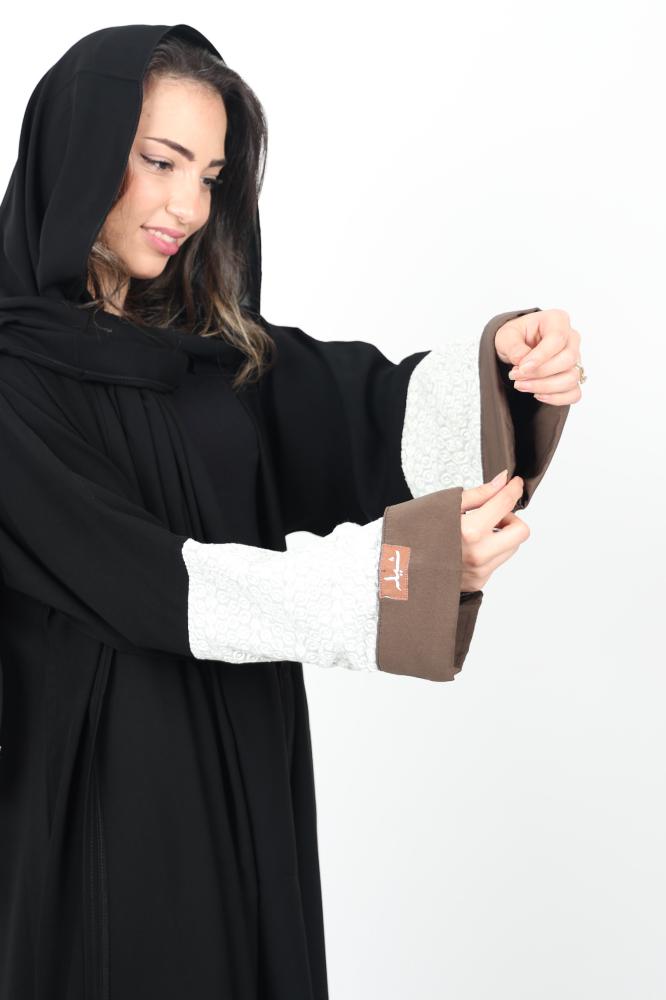 عباية بتصميم مميز على الكم بقلبة على الأكمام باللون الزيتي تضفي طابع من الرقي