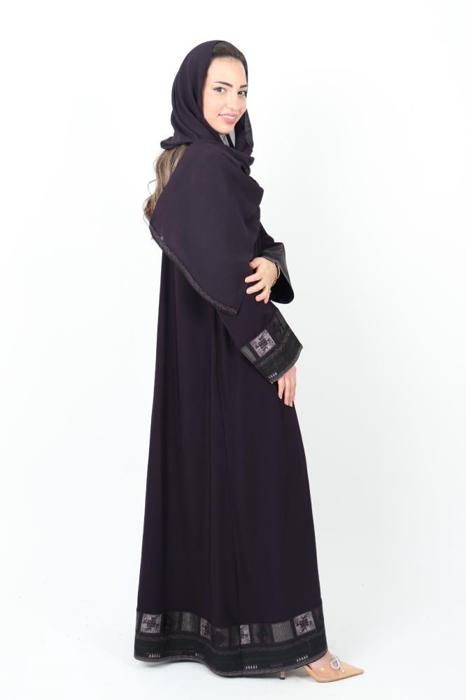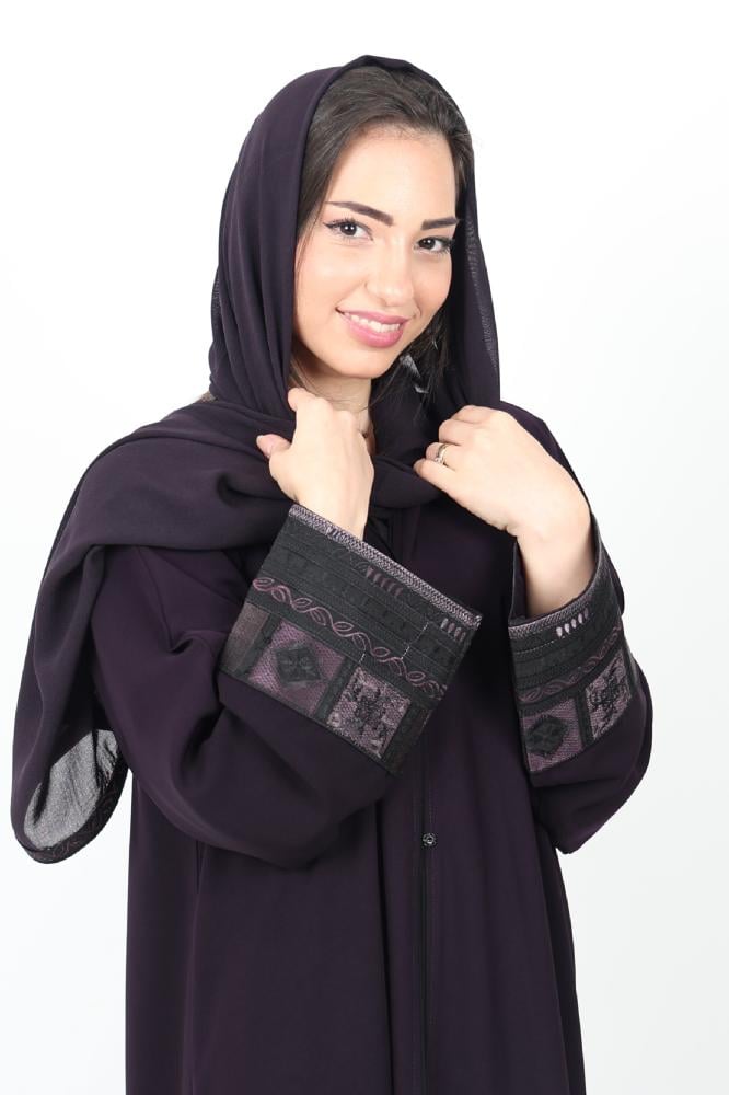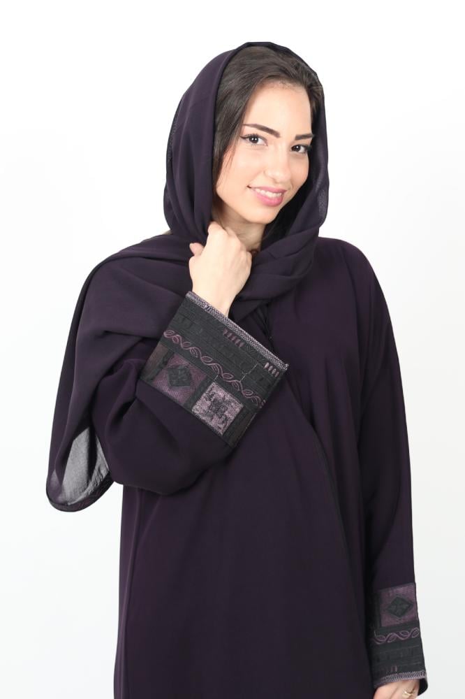 عباية باللون البنفسجي بتطريز تراثي على الكم ومن اسفل العباية